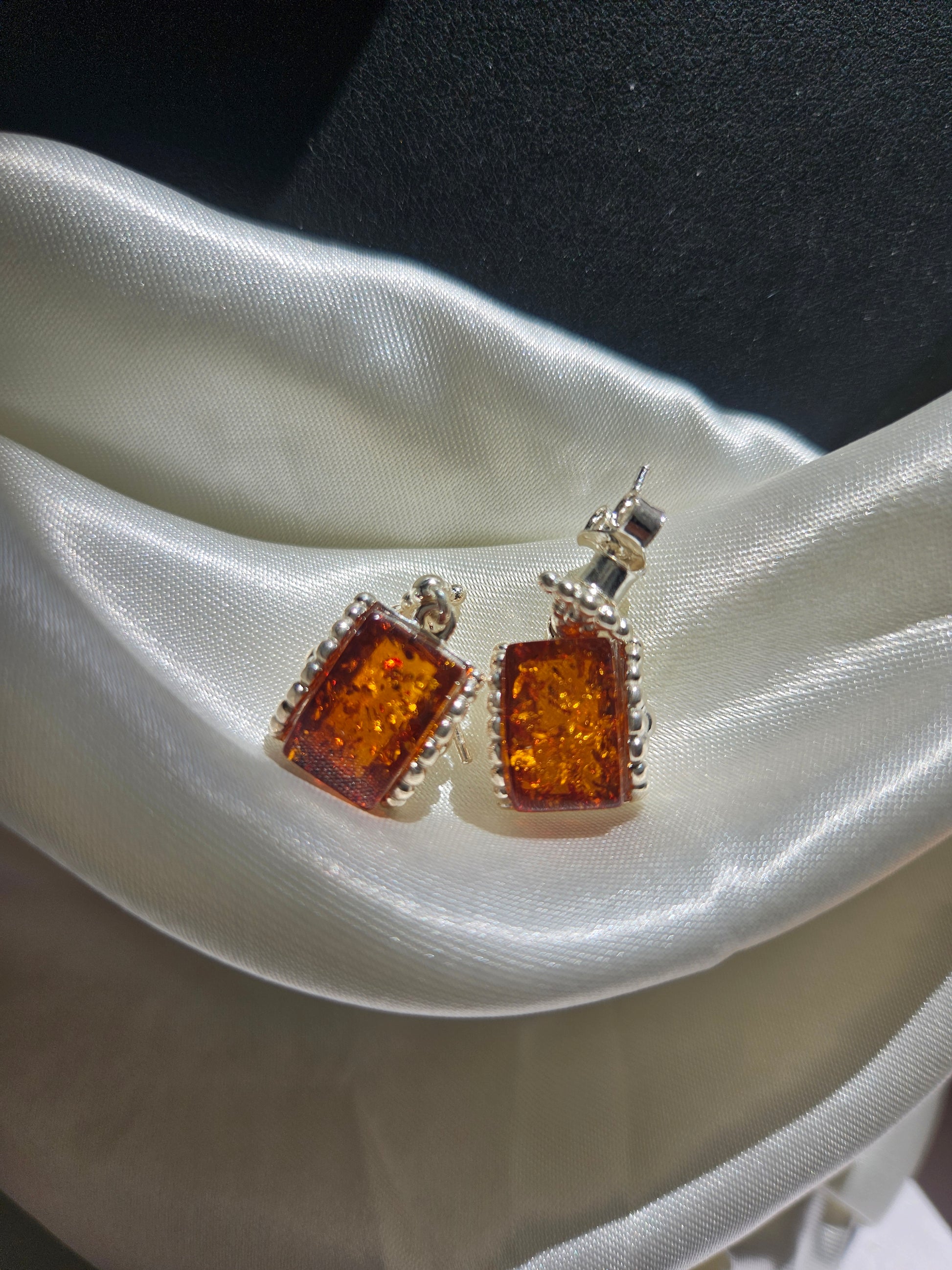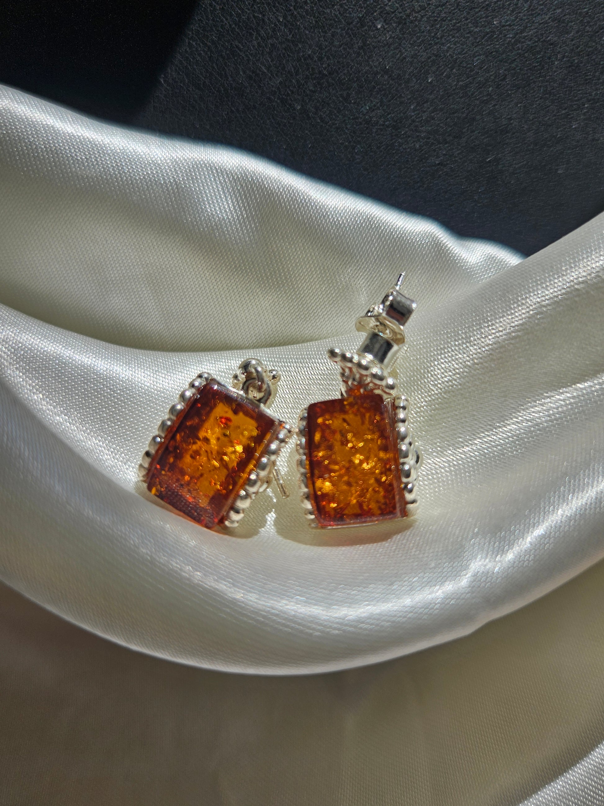 The main stone of this earring is a precious natural amber - the flower amber. Huapo does not refer to the presence of flowers in amber, but rather to the unique texture formed inside amber during its formation, resembling a blooming flower, due to the expansion of internal bubbles caused by heat. Under the illumination of light, these textures present bright white patterns in the form of flakes or clouds, as if encapsulating eternal flowers in crystal clear amber. Each pair of earrings has a unique texture, making them an irreplaceable work of art.