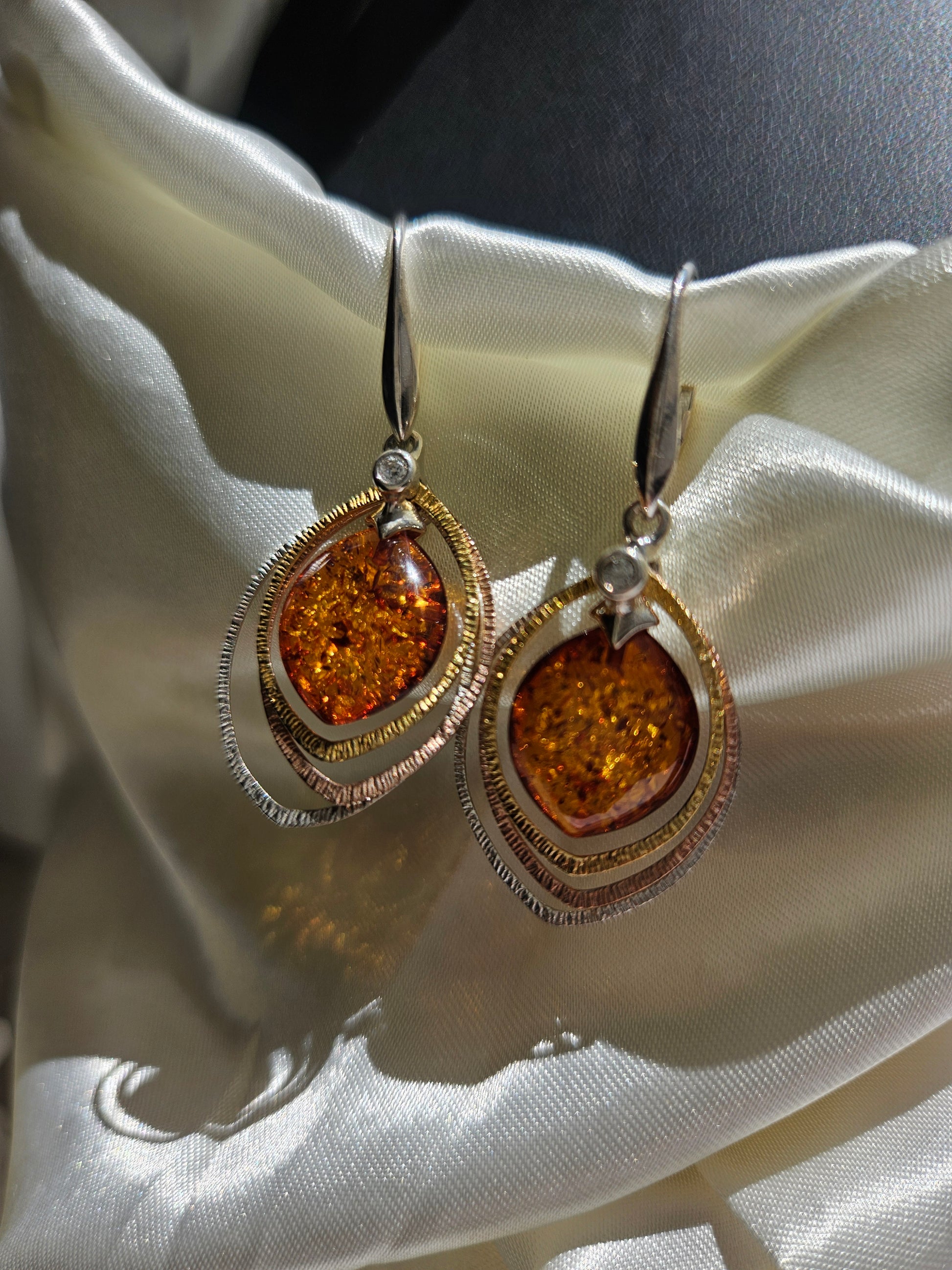 The main stone of this earring is a precious natural amber - the flower amber. Huapo does not refer to the presence of flowers in amber, but rather to the unique texture formed inside amber during its formation, resembling a blooming flower, due to the expansion of internal bubbles caused by heat. Under the illumination of light, these textures present bright white patterns in the form of flakes or clouds, as if encapsulating eternal flowers in crystal clear amber. Each pair of earrings has a unique texture, making them an irreplaceable work of art.