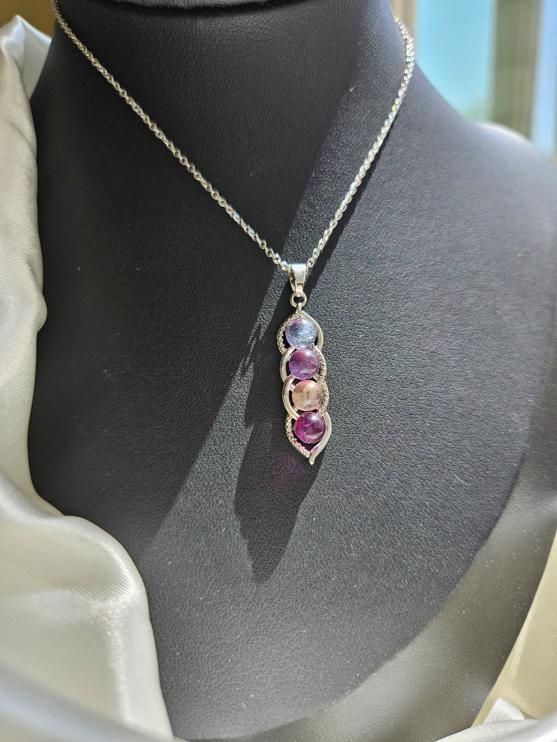 This is a beautiful natural fluorite pendant necklace. Fluorite is a calcium fluoride mineral known for its rich colors, including purple, pink, green, blue, yellow, and colorless. Many fluorites have the characteristic of multiple colors coexisting, which is also their unique charm.
