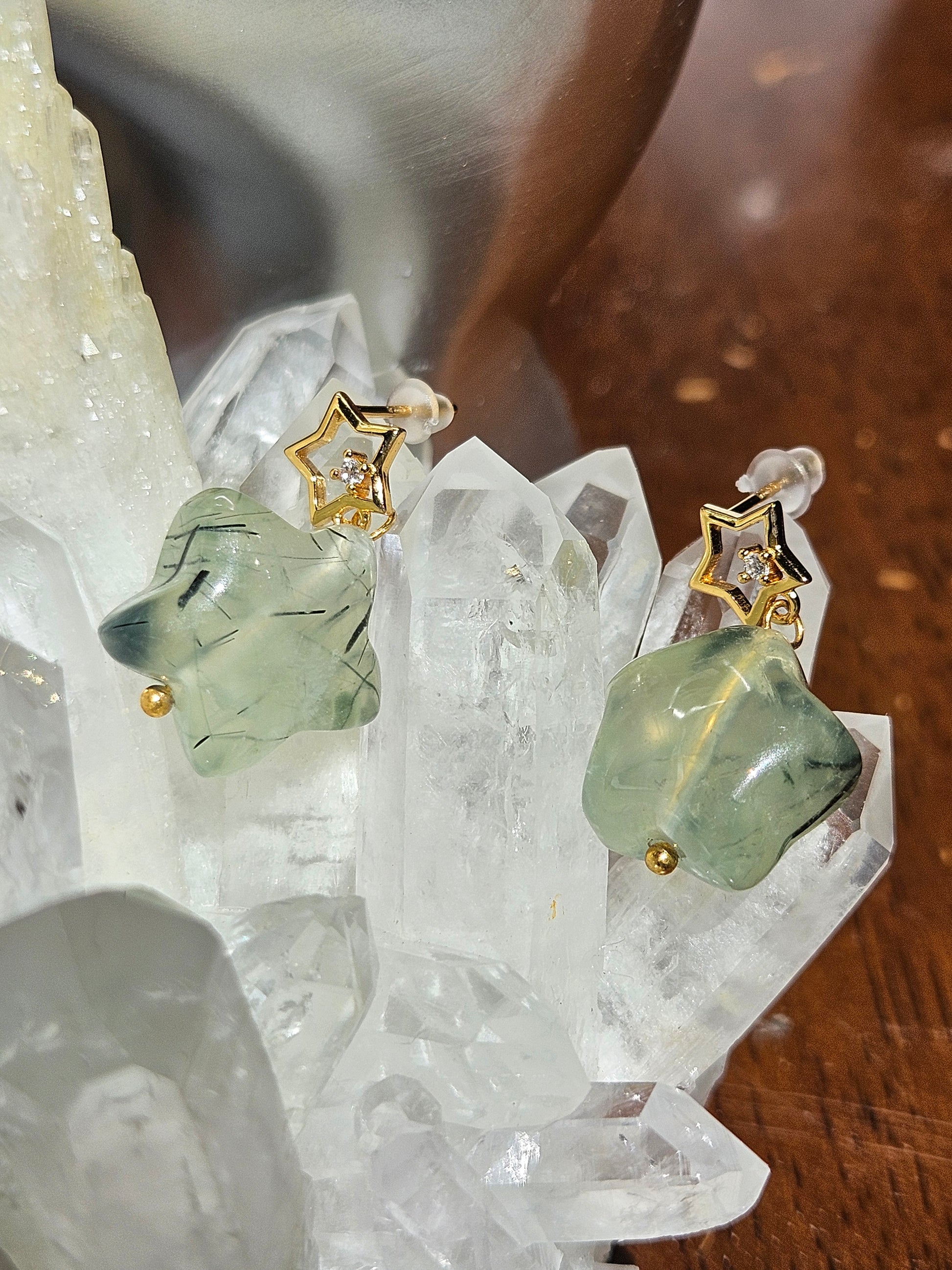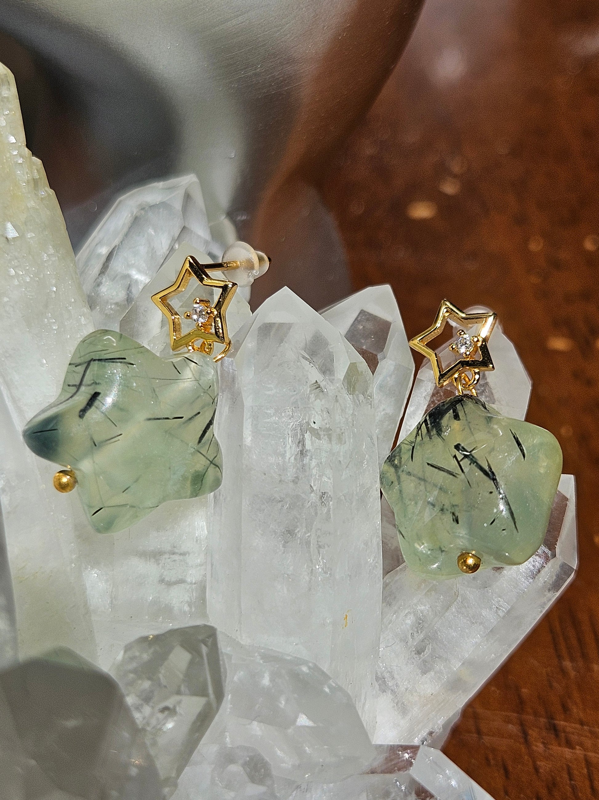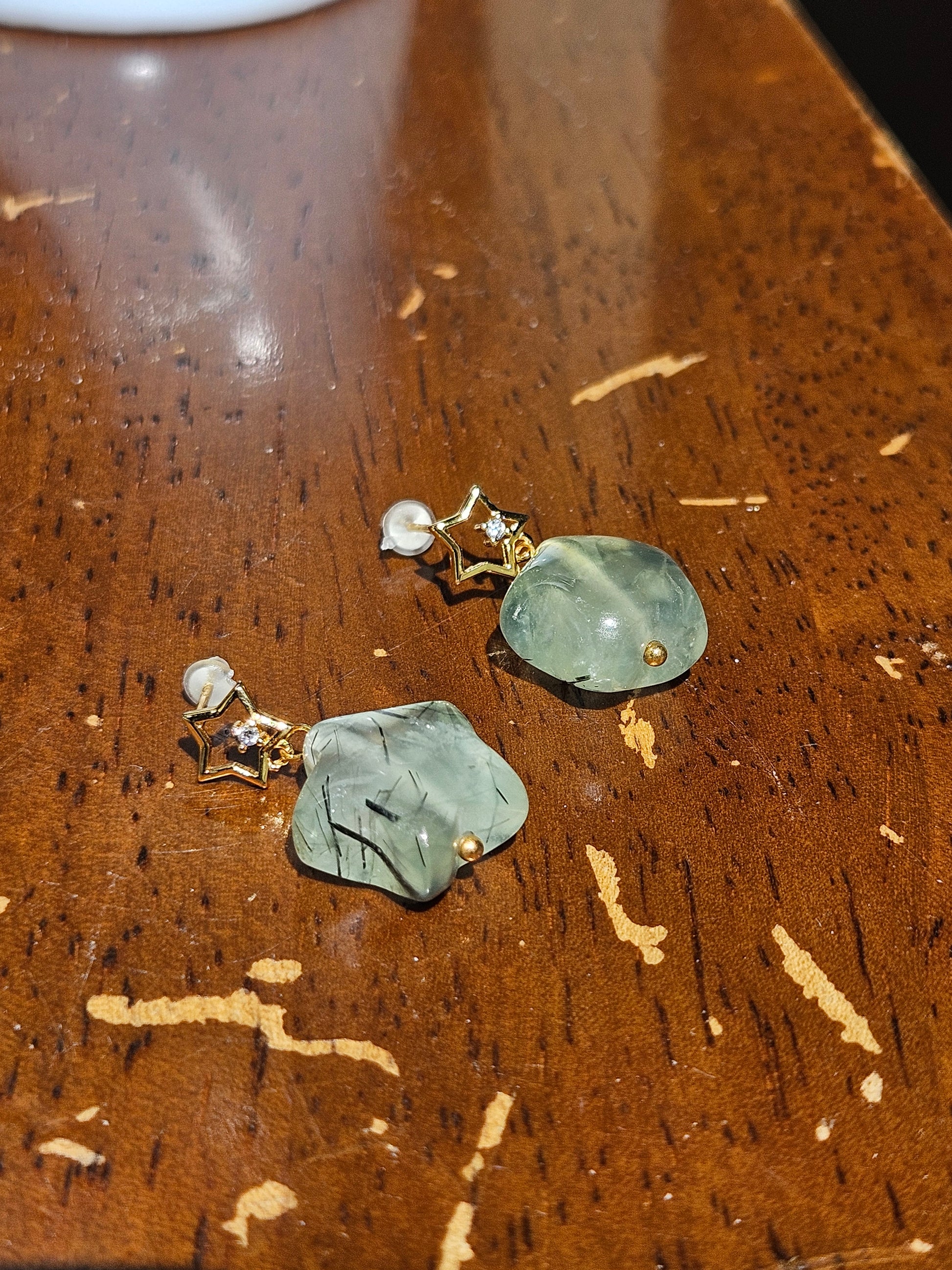Natural Green Crystal and Black Hair Crystal: The main stone of the earrings is made of natural green crystal, which is transparent and emits a subtle green light, giving people a fresh and healing feeling. What's even more special is that each green crystal is wrapped with delicate black hair crystals inside, and these hair like inclusions are faintly visible under the light, like shooting stars passing through the night sky, adding a unique sense of layering and agility to the pendant.