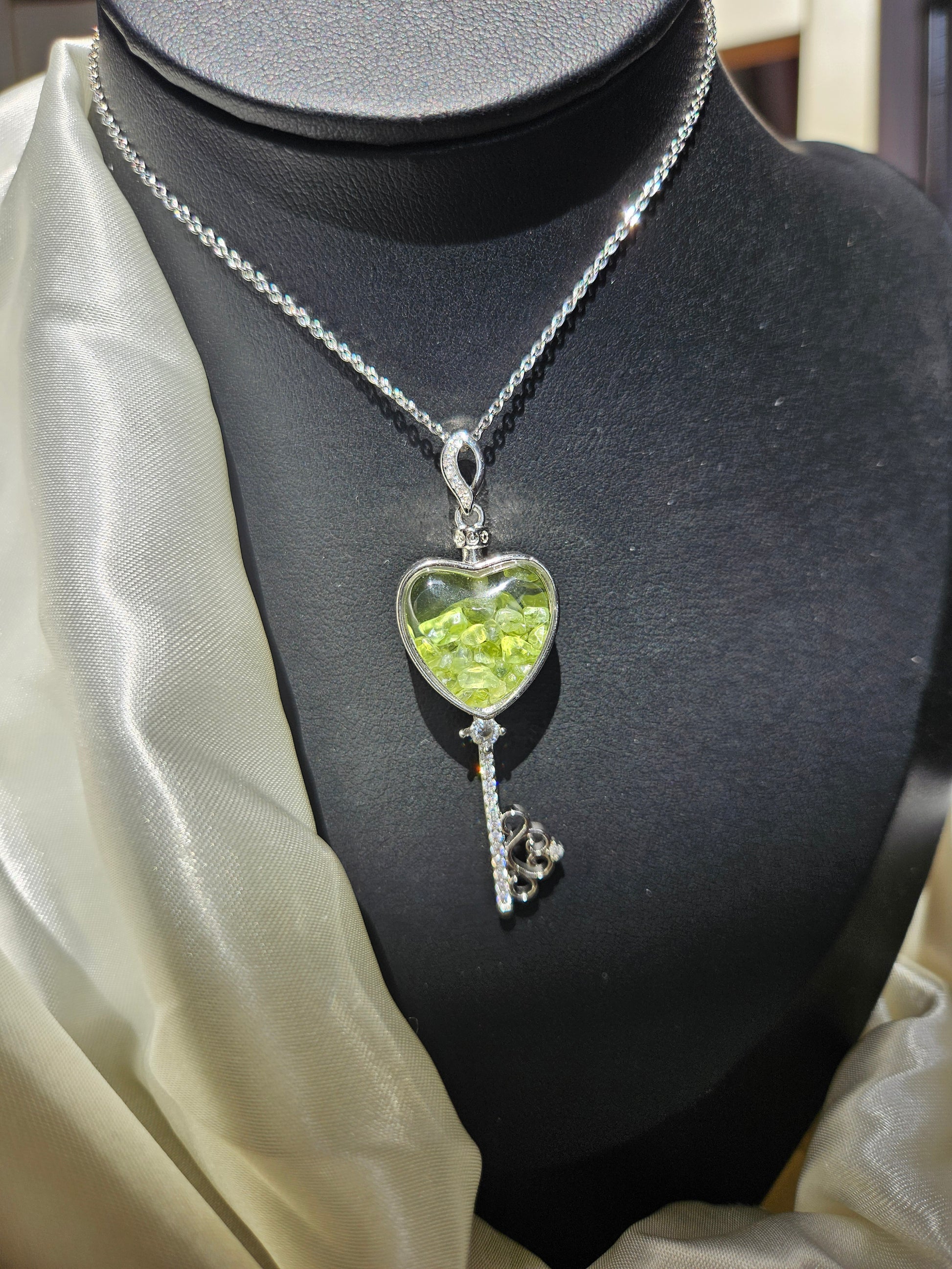 Natural Olivine Wishing Bottle Key Shaped Necklace Silver Plated