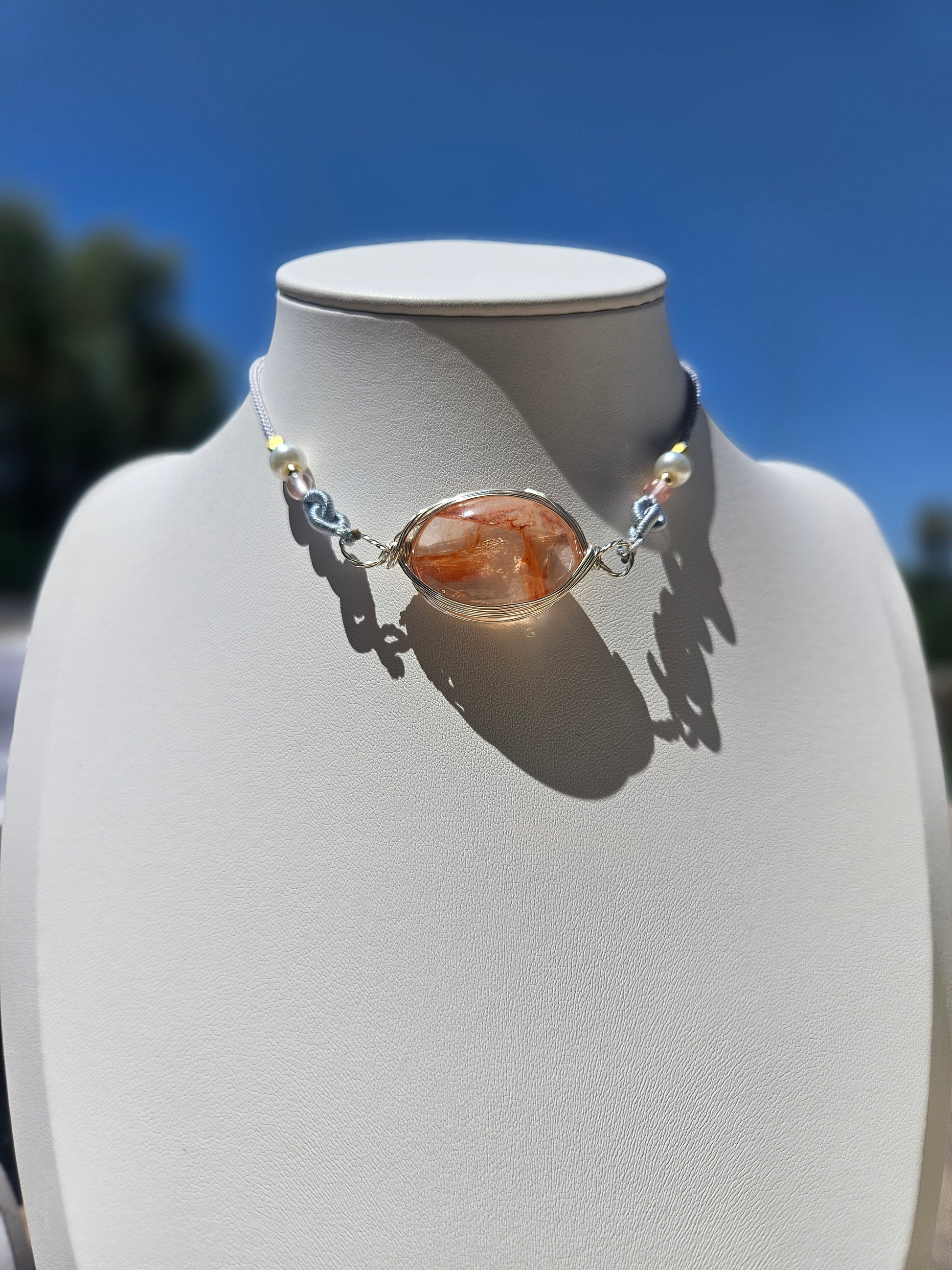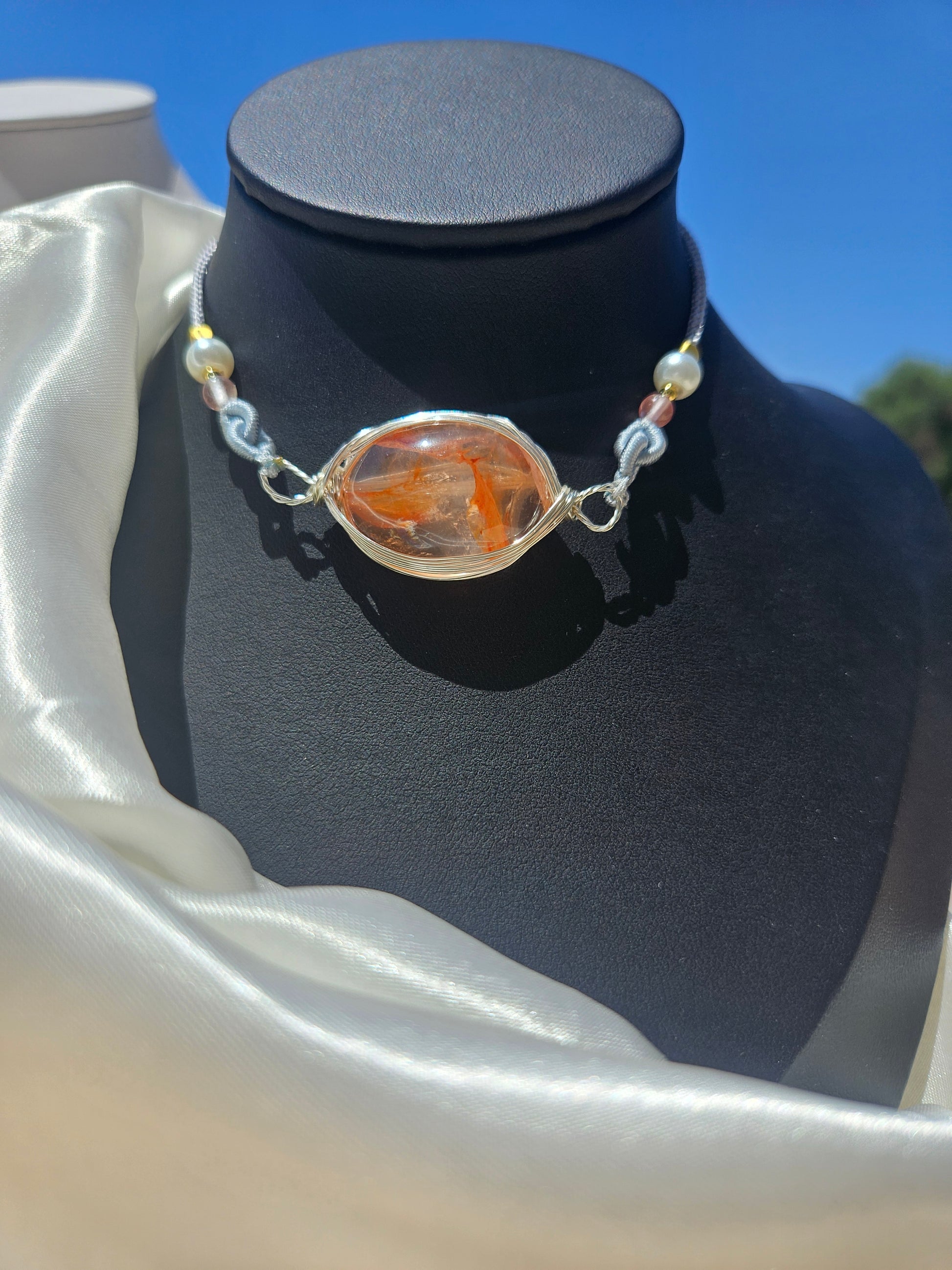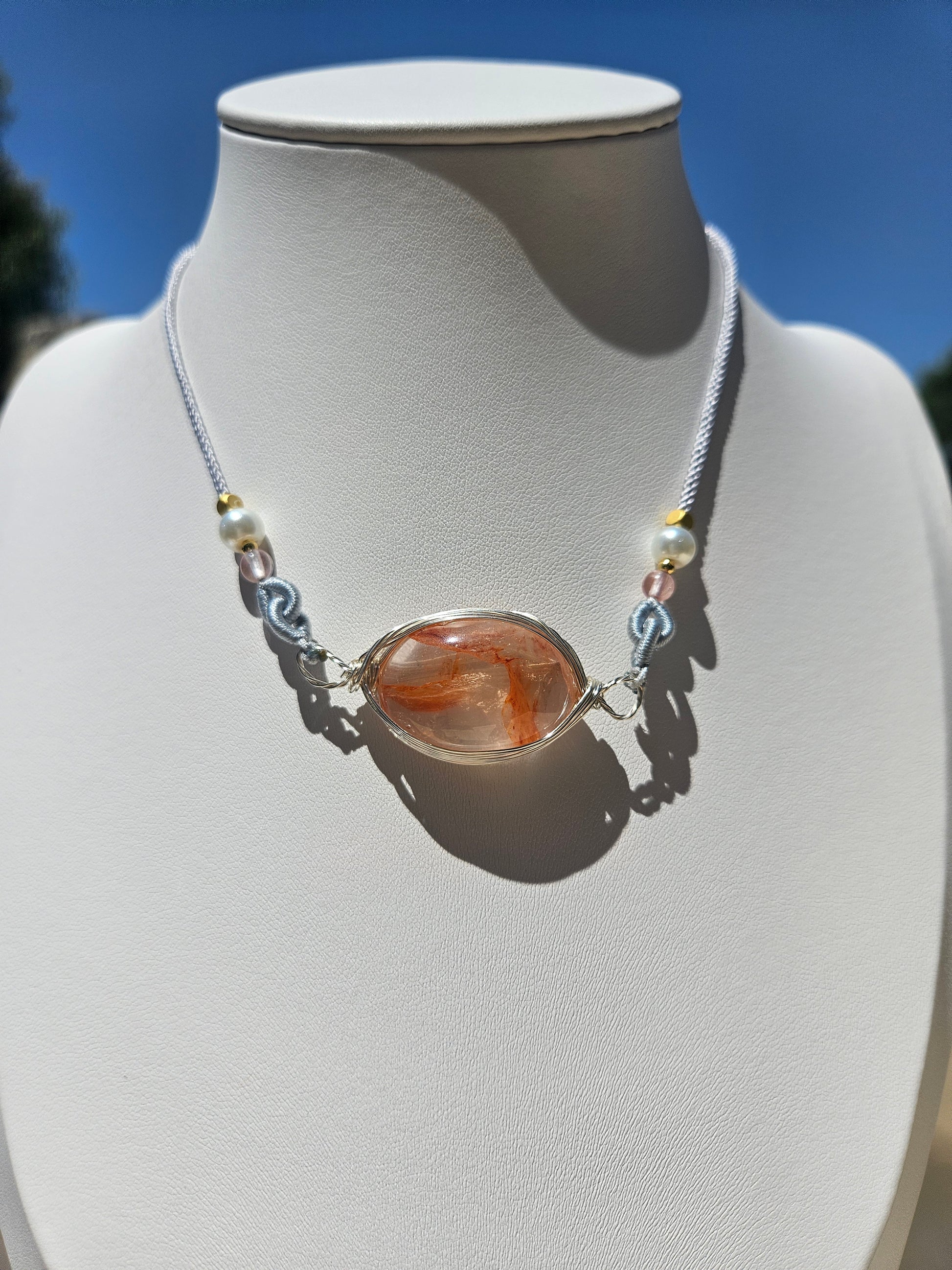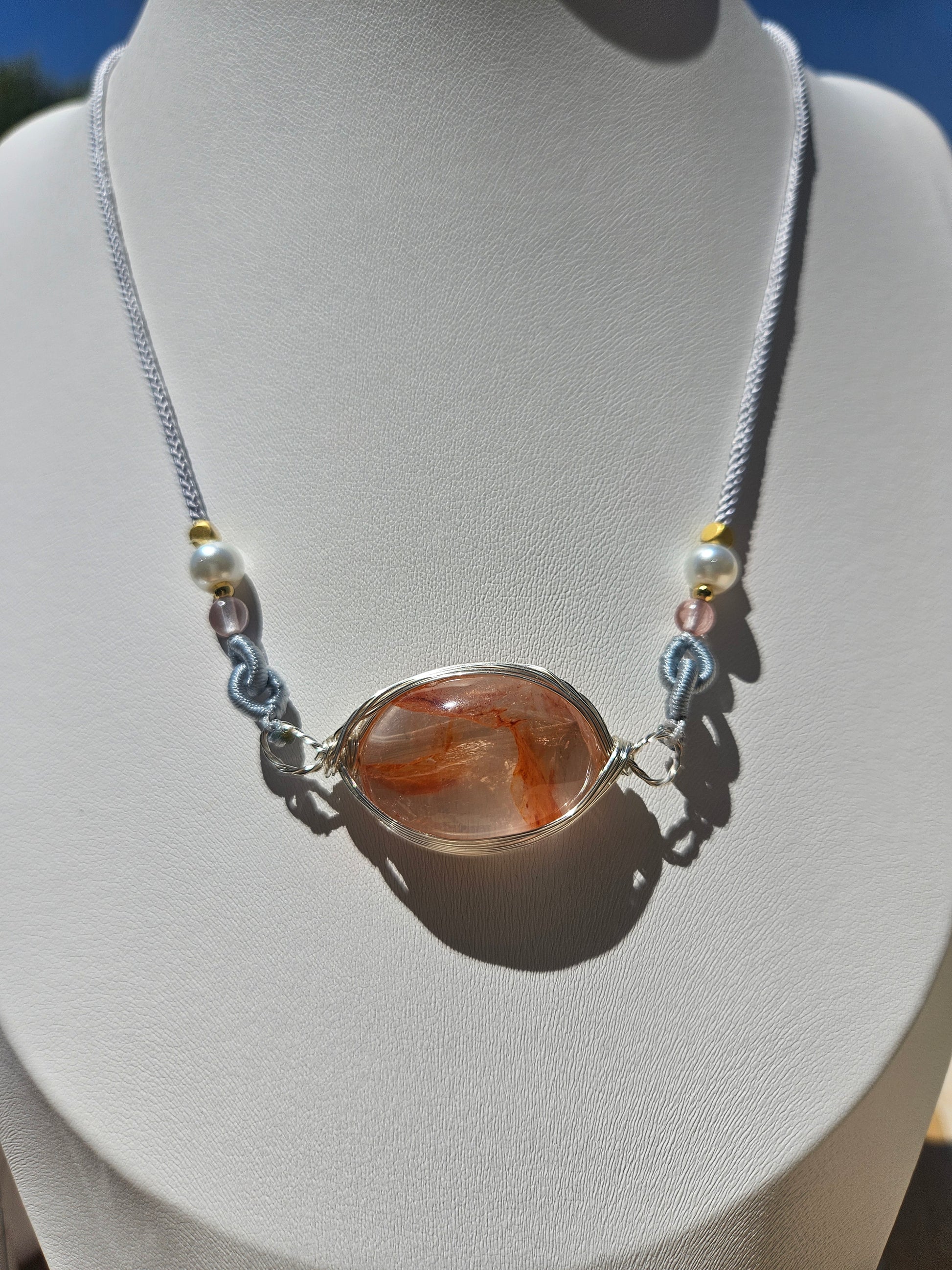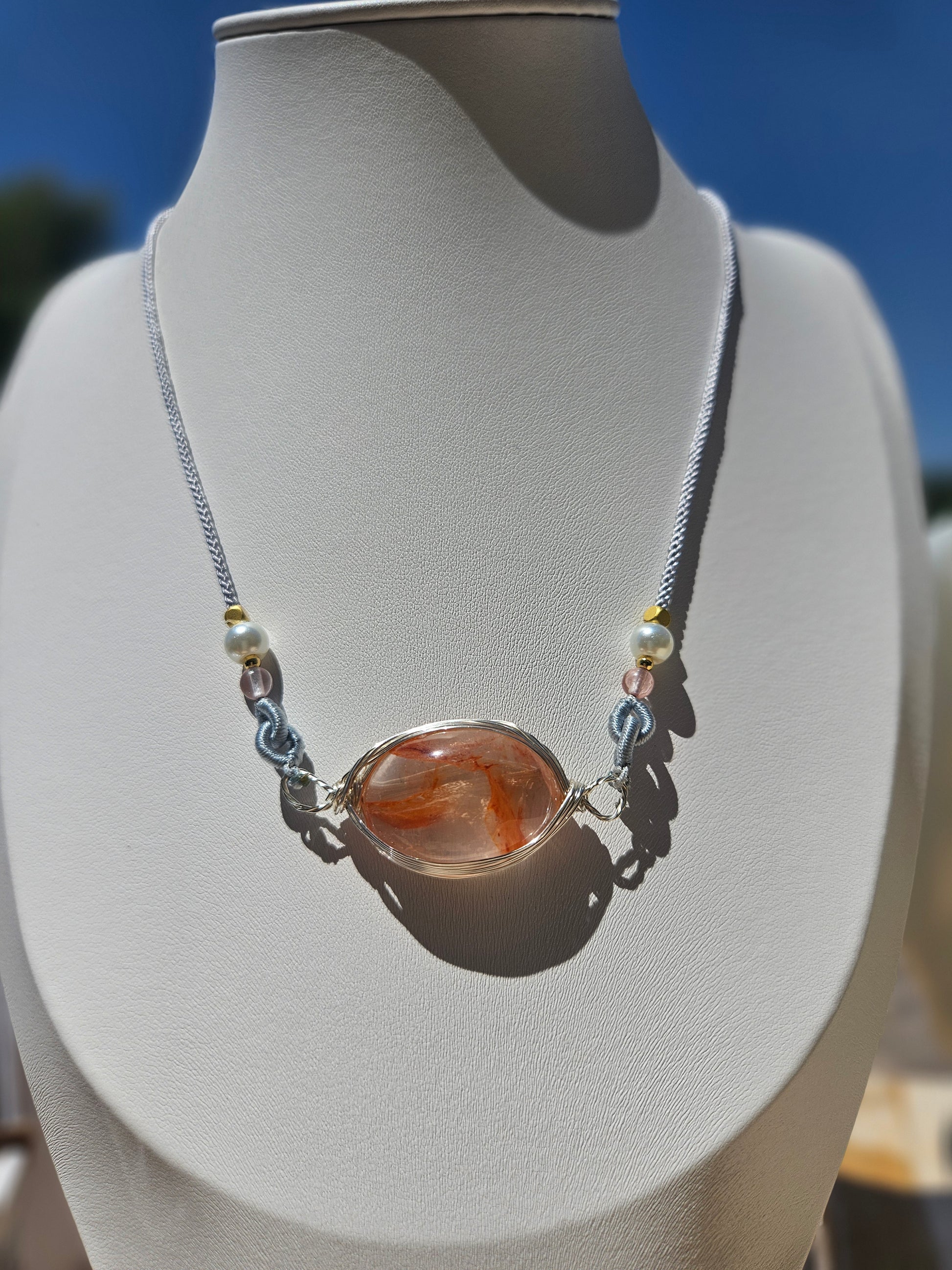 This necklace is centered around a rare and unique natural crystal - Red Phantom Quartz. The design concept is to highlight the red inclusions inside the crystal that resemble flowers or clouds, presenting the artistic beauty of nature's exquisite craftsmanship. Each pendant is unique, with a red "pattern" inside that seems like a painting frozen in time, full of mystery and vitality.