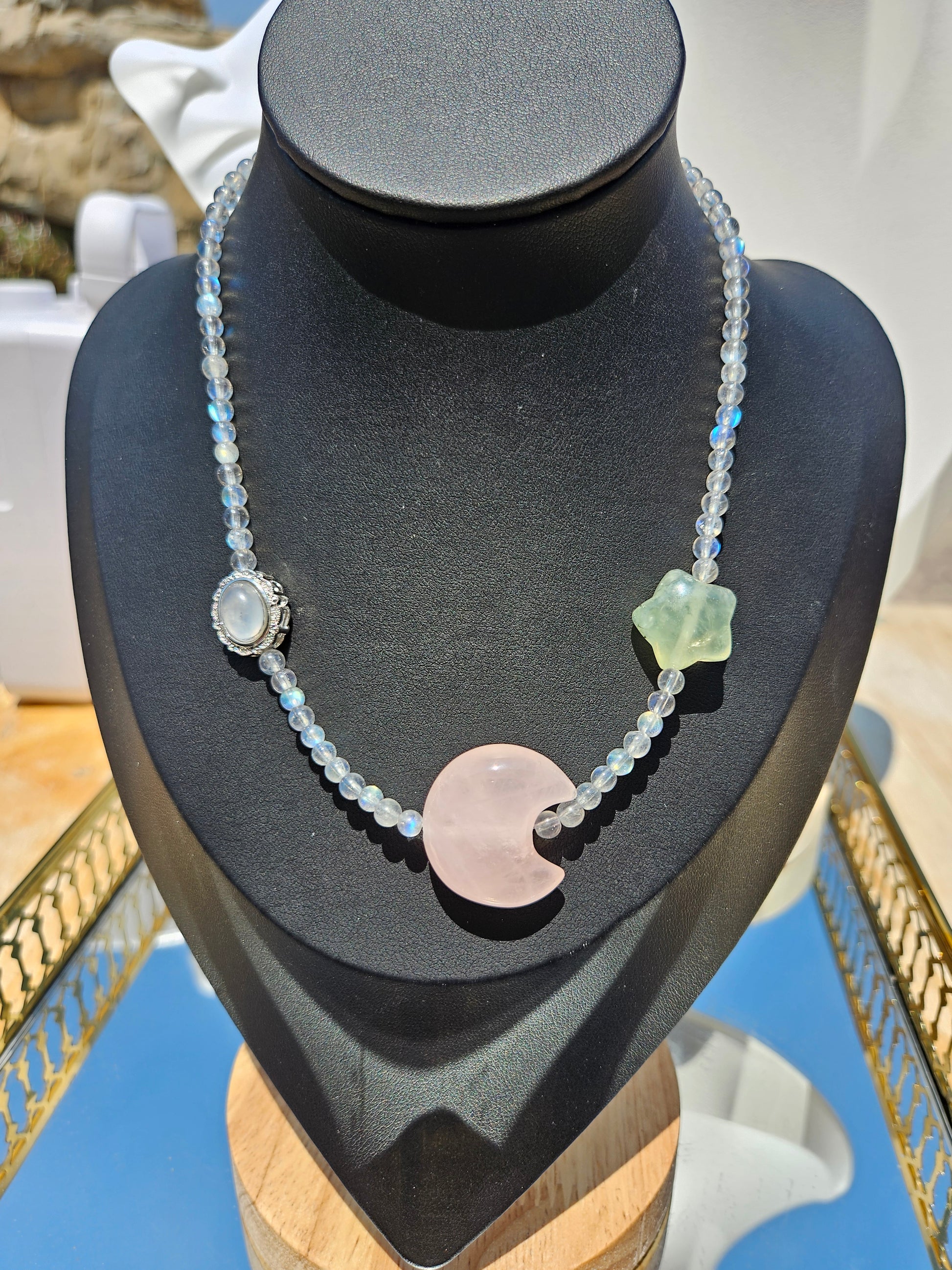 "Summer Night Stars and Moon" natural rose quartz and green hair crystal with pure natural moonstone bead necklace